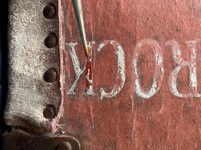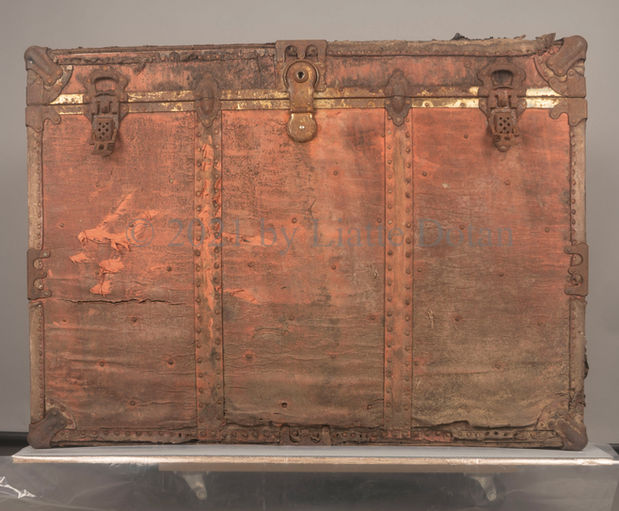 The laminate paper covering was cleaned, stabilized, and areas of missing material were visually compensated. Lost leather binding segments were re-created, and each metal component was cleaned and coated to prevent future corrosion formation. The interior of the trunk, which had long been locked away, was excavated to remove the assorted items.