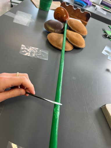 Replicating the plastic's color, texture, sheen and uniformity required extensive material tests. Casting a mixture of bulked acrylic paint on a smooth surface resulted in a workable "sheet" that was then heat-set around the metal shaft.