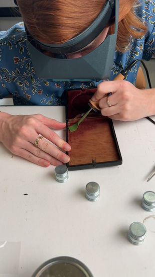The object was very delicate prior to treatment with losses throughout the leather covering. The interior silk lining was significantly deteriorated with many broken and lost colored weft strands.